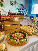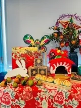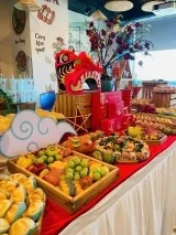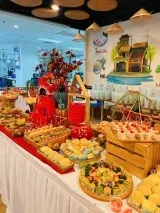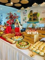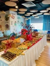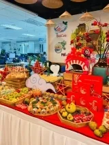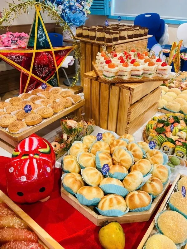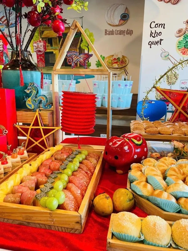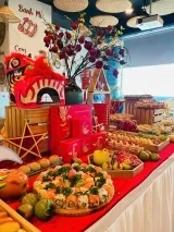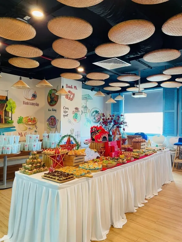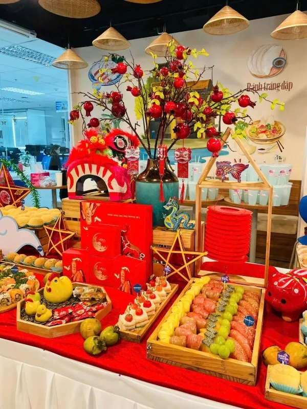 Nếu những chiếc bánh su, bánh mochi gợi nhớ đến chất teabreak quen thuộc nơi văn phòng, thì sushi và salad là điểm nhấn tươi mới và hiện đại. Nhờ sự kết hợp này, bàn tiệc mở ra trải nghiệm mang hơi thở quốc tế giữa không gian vintage của khay gỗ, đèn lồng, đầu lân.