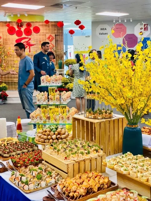 Bàn tiệc fingerfood thịnh soạn được chuẩn bị kỹ lưỡng để chiêu đãi nhân sự trong ngày hội thao Cửu Long JOC, với đa dạng món ăn nhẹ, dễ thưởng thức, từ các món bánh mặn, ngọt đến các món ăn tươi ngon, đầy đủ hương vị. Mỗi món ăn đều được bày trí tinh tế, tạo nên không gian ấm cúng, năng động và giúp các thành viên thư giãn, tiếp thêm năng lượng sau những giờ phút thi đấu sôi nổi.
