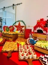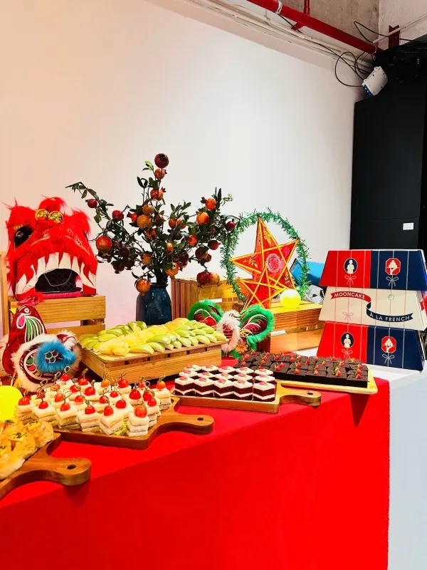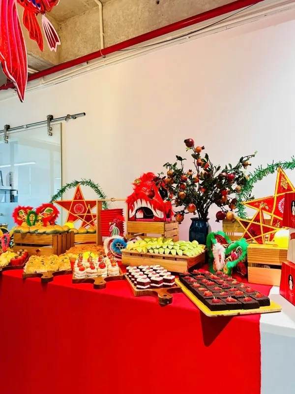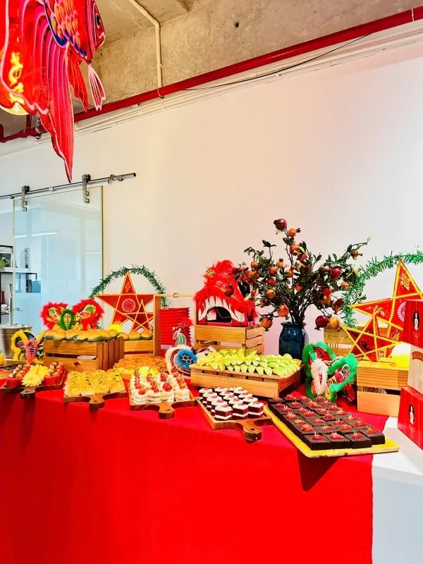 Bàn tiệc được setup nhanh gọn ngay tại công ty, với tone vàng – đỏ chủ đạo, kết hợp phụ kiện Trung Thu rực rỡ. Thực đơn 9 món cân bằng giữa bánh mặn, bánh ngọt và trái cây, vừa ngon miệng vừa đẹp mắt: