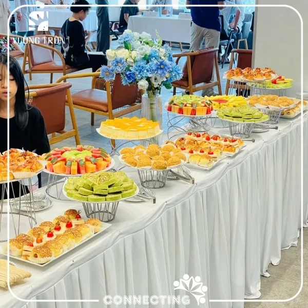 Không gian sự kiện được giữ phong cách tối giản - hiện đại, tập trung vào sự thoải mái. Ở một góc nhỏ, bàn tiệc do Vuông Tròn chuẩn bị trở thành điểm nhấn nhẹ nhàng với menu 8 món thơm ngon: