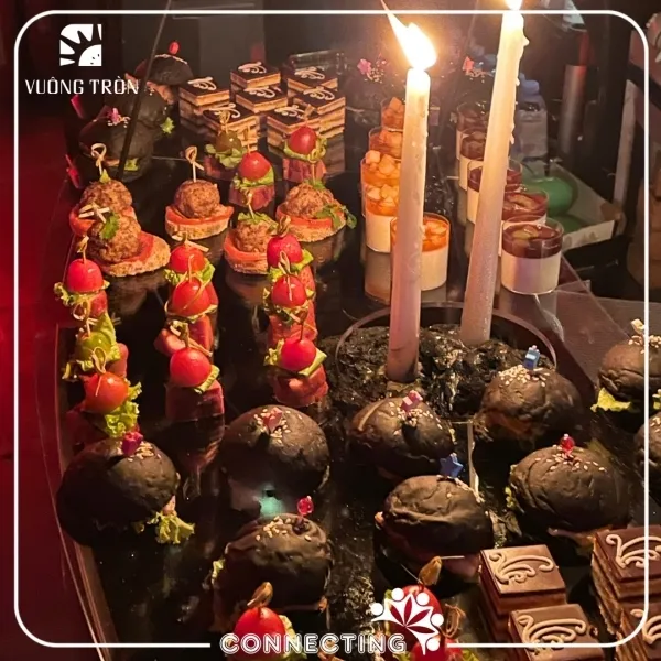Trong sự kiện Faham Sales Champion Party, bữa tiệc đã được bật mode bóng đêm đúng nghĩa: sang trọng, bí ẩn nhưng vẫn bùng nổ năng lượng. Và Vuông Tròn hân hạnh đồng hành trong vai trò đối tác setup tiệc finger food, góp phần hoàn thiện trải nghiệm ẩm thực cho toàn bộ đêm tiệc.