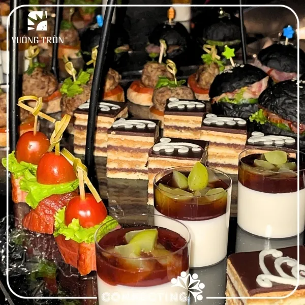 Từng món dược chuẩn bị kỹ lưỡng, để không chỉ ngon miệng mà còn để hòa hợp với không gian, ánh sáng và tinh thần sự kiện: Những chiếc hamburger với vỏ bánh đen tuyền, từng chiếc tomato beef đậm đà với vị thịt bò và chua nhẹ của lát cà chua, cho đến teriyaki sausage thơm lừng... tất cả như dẫn vị giác vào một hành trình mới lạ. Kết thúc bằng chiếc opera dark và panna cotta - dư vị ngọt ngào khép lại một đêm đầy cảm hứng.