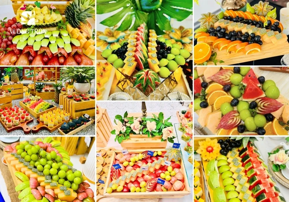 Để bữa tiệc thêm đầy đủ thì không thể thiếu các loại trái cây, hoa quả được cắt sẵn phục vụ khách mời. Một số loại trái cây phổ biến thường dùng trong tiệc khai trương như: dưa hấu, nho mỹ, thanh long, dưa lưới, kiwi, táo gala, ổi, thơm...