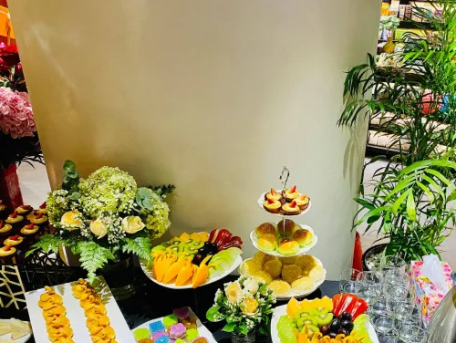 Tiệc được dùng để đón khách nội bộ và đối tác nên menu nhẹ nhàng với bánh mini chủ lực, cùng trái cây tươi và detox thanh lọc.