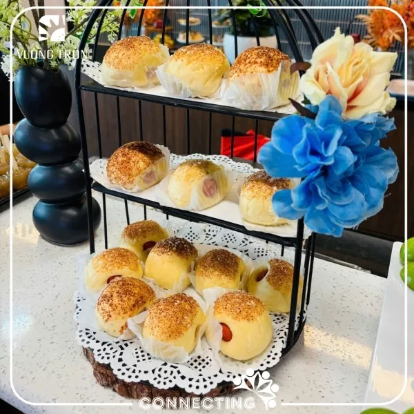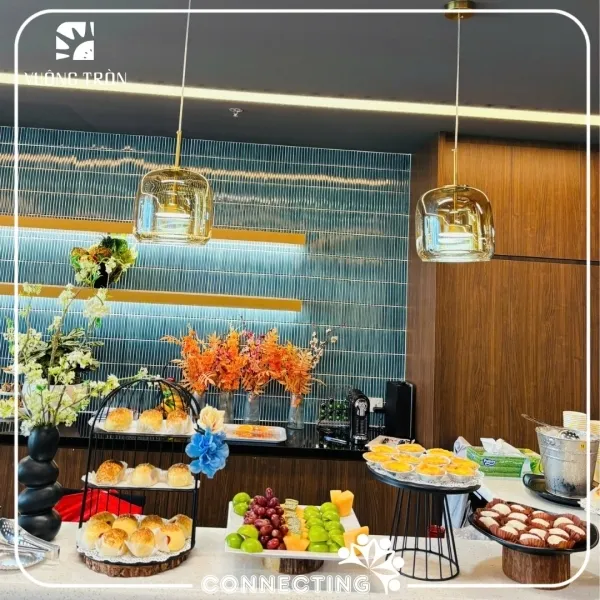 Bên cạnh phần lễ trang trọng, sự kiện còn tạo nên dấu ấn tinh tế nhờ bàn tiệc teabreak hiện đại. Thực đơn được sắp đặt khéo léo với 7 món vừa lạ vừa quen: