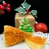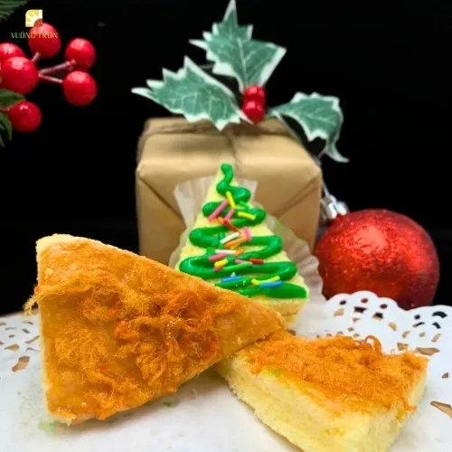 Bánh được làm từ cốt bông lan tách lòng mềm mịn, phần nhân bên trong là sốt bơ trứng hòa quyện chà bông gà cay, mang đến hương vị béo mặn nhẹ nhàng, dễ ăn. Mặt bánh được vẽ hình cây thông Noel bằng socola, trang trí thêm kẹo màu tạo hình sinh động, rực rỡ.