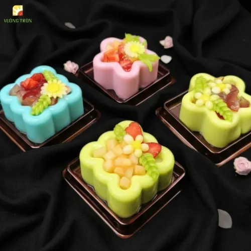 - Tạo hình hoa nghệ thuật: Không chỉ là món ăn, mỗi chiếc rau câu được thiết kế với khuôn hoa đa dạng. Điểm nhấn nằm ở phần nhụy hoa làm từ trái cây tươi cắt hạt lựu, tạo nên vẻ ngoài bắt mắt và sống động.