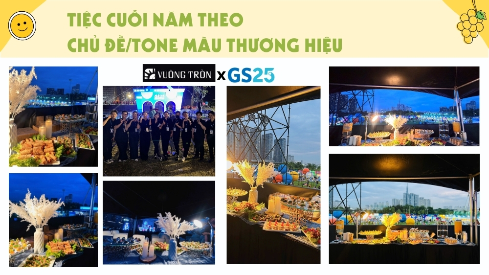 Thẩm mỹ: trang trí bàn tiệc liên hoan đồng bộ màu thương hiệu, đẹp mắt, hiện đại.