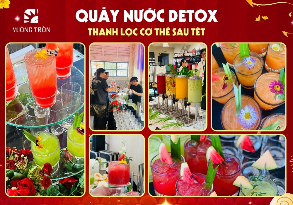 Thay vì những hình thức tiệc truyền thống dễ gây ngán sau Tết, Vuông Tròn mang đến giải pháp tiệc tân niên tận nơi với quầy nước sự kiện detox đầu năm - một lựa chọn nhẹ nhàng, hiện đại và tinh tế, đặc biệt phù hợp cho văn phòng và sự kiện nội bộ doanh nghiệp.