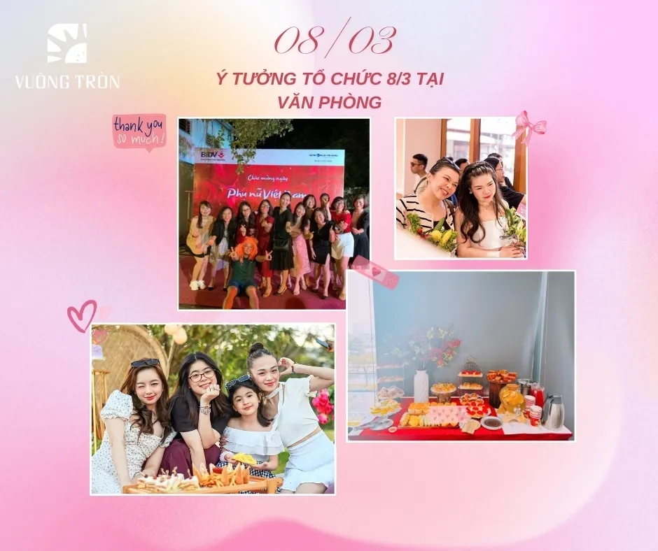 Vuông Tròn đã gợi ý cho bạn những ý tưởng tổ chức ngày quốc tế phụ nữ 8/3 tại văn phòng công ty rồi nè, hi vọng thông qua những ý tưởng này chị em sẽ có những phút giây vui vẻ và thư giản sau những ngày làm việc năng suất, cũng như góp phần gắn kết được nội bộ công ty vì đã dành cho các bóng hồng một sự kiện 8/3 trọn vẹn niềm vui. Hơn nữa, cánh mày râu cũng được dịp ghi điểm trong mắt chị em phụ nữ luôn nhé.