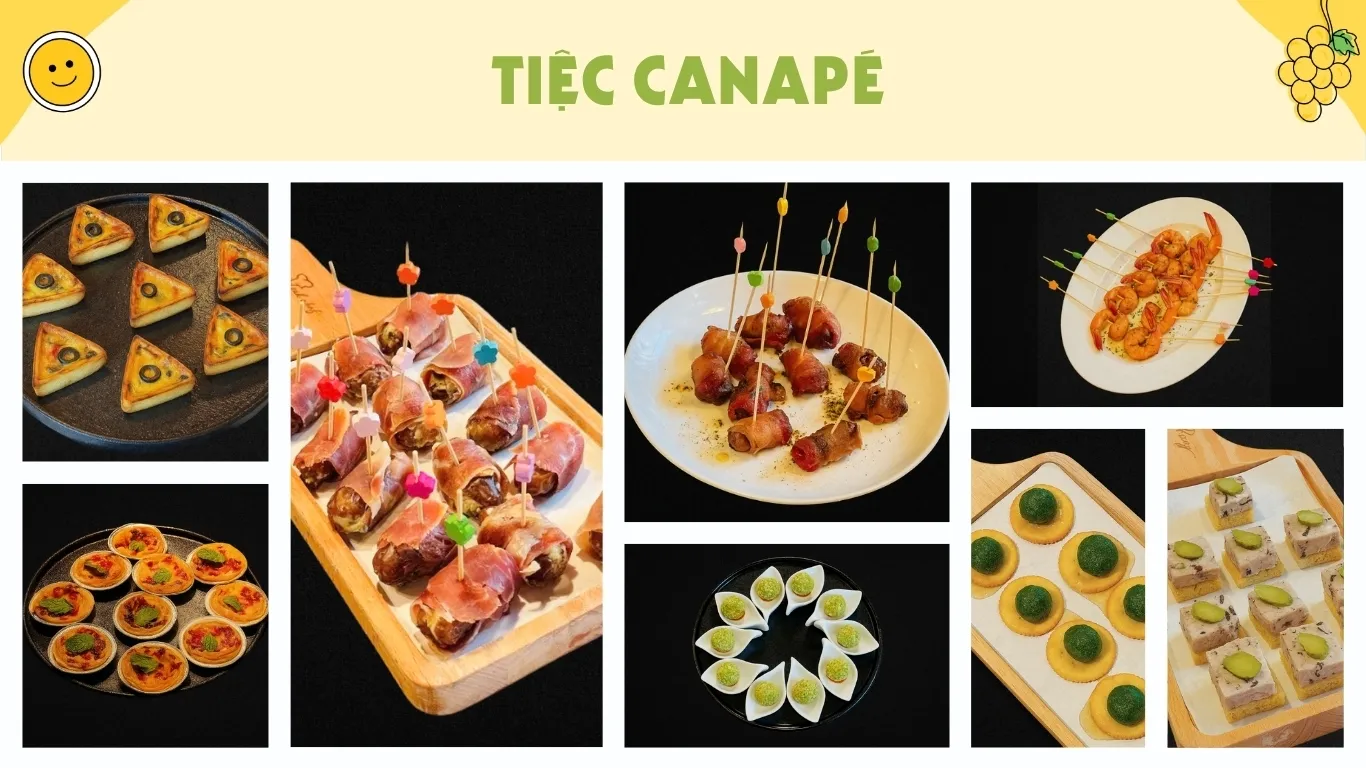 Tiệc Canapé là dạng finger food cao cấp, sử dụng đế bánh nhỏ như cracker, toast hoặc bánh mì baguette mini phủ lên lớp topping được chế biến tinh xảo: cá hồi xông khói, phô mai, pate, thịt nguội hay rau củ. Mỗi miếng canapé được thiết kế để thưởng thức trọn vị trong một lần cắn, thể hiện sự thanh lịch và phong cách châu Âu.