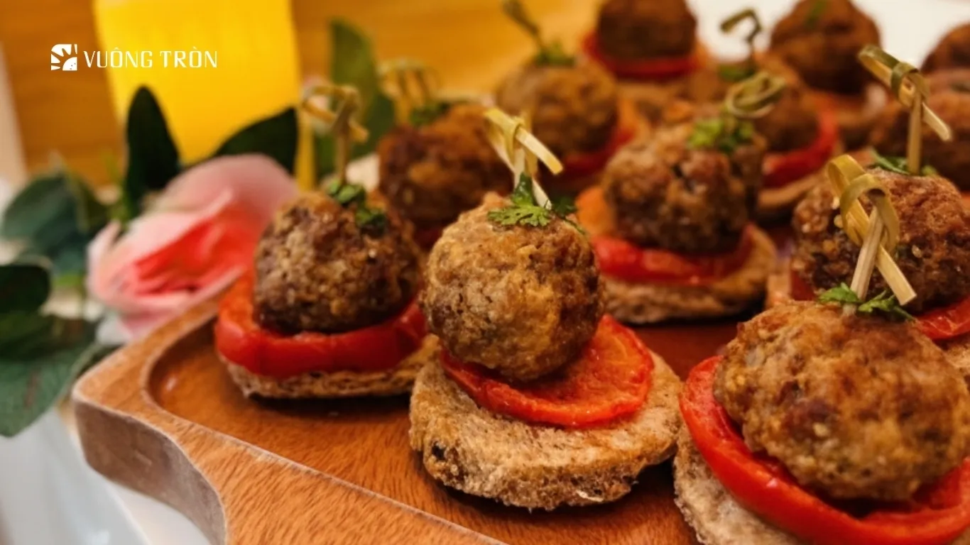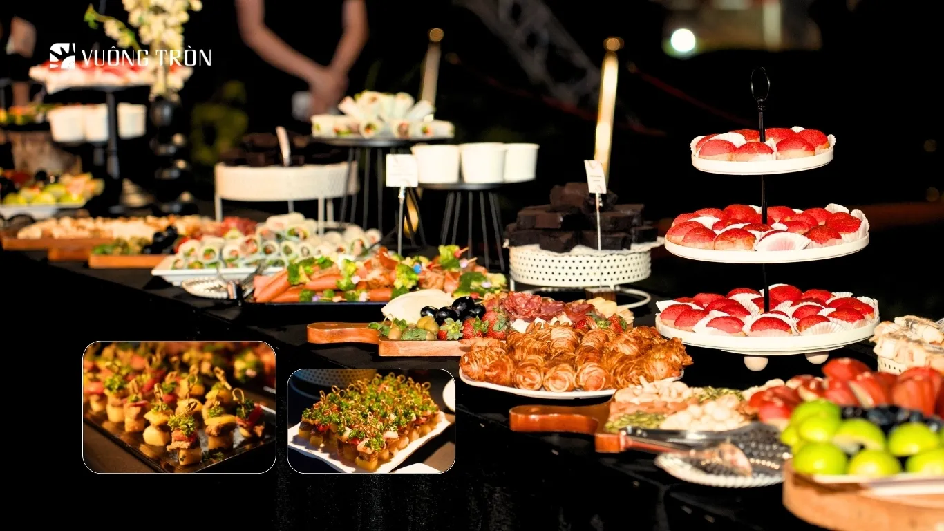 - Canapé ngọt như tart trái cây mini, mousse nhẹ hoặc chocolate bite giúp tạo điểm chạm cân bằng vị giác. Bàn tiệc thường được trang trí theo tầng hoặc khay gỗ, tạo điểm nhấn sang trọng ngay khi nhìn vào.
