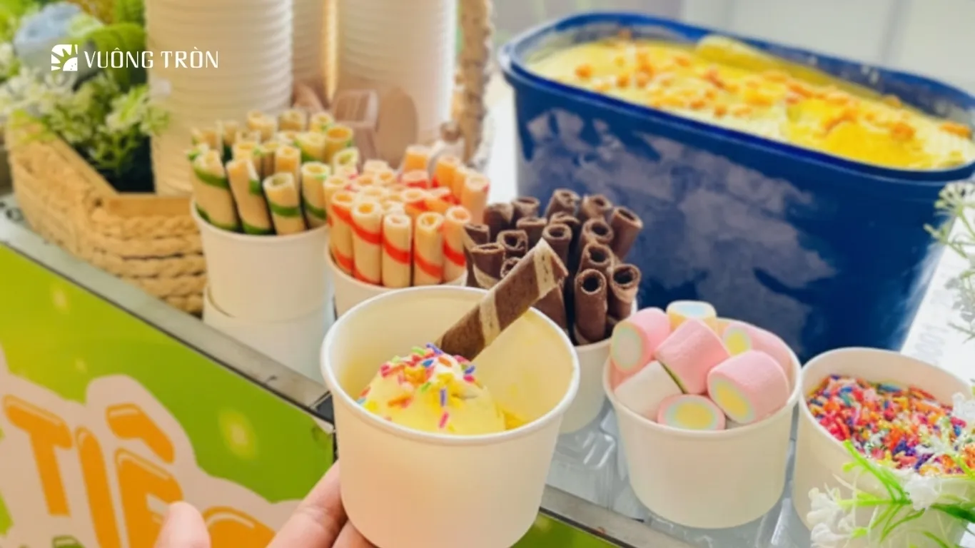 Các lựa chọn kem phổ biến gồm kem dừa, kem vani, kem socola, kem matcha hoặc kem rum nho. Khi kết hợp cùng các loại topping như bánh quế, chocolate chips, marshmallow... món kem sẽ trở nên đa dạng và tạo cơ hội để khách tự mix theo khẩu vị và sở thích của mình.