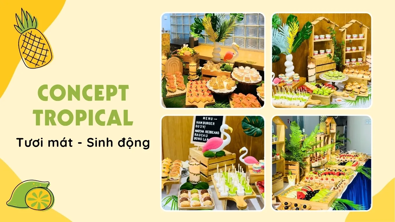 Concept Tropical mang lại không gian tươi mát, sinh động. Nếu bạn muốn một không gian tươi sáng và tràn đầy năng lượng, thì concept với tone xanh lá - vàng - cam với điểm nhấn lá dừa và hoa nhiệt đới này sẽ mang đến một cảm giác rực rỡ, trẻ trung.