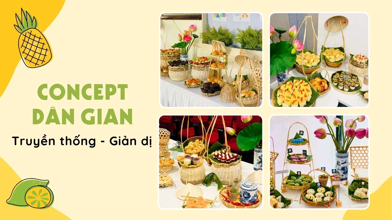 Concept Dân Gian mang lại cảm giác truyền thống, giản dị. Đưa mọi người trở về sự mộc mạc, gần gũi của văn hóa Việt Nam với mẹt tre, lá chuối, hoa sen và các sắc màu nâu - vàng, rất phù hợp cho những dịp lễ hội truyền thống.