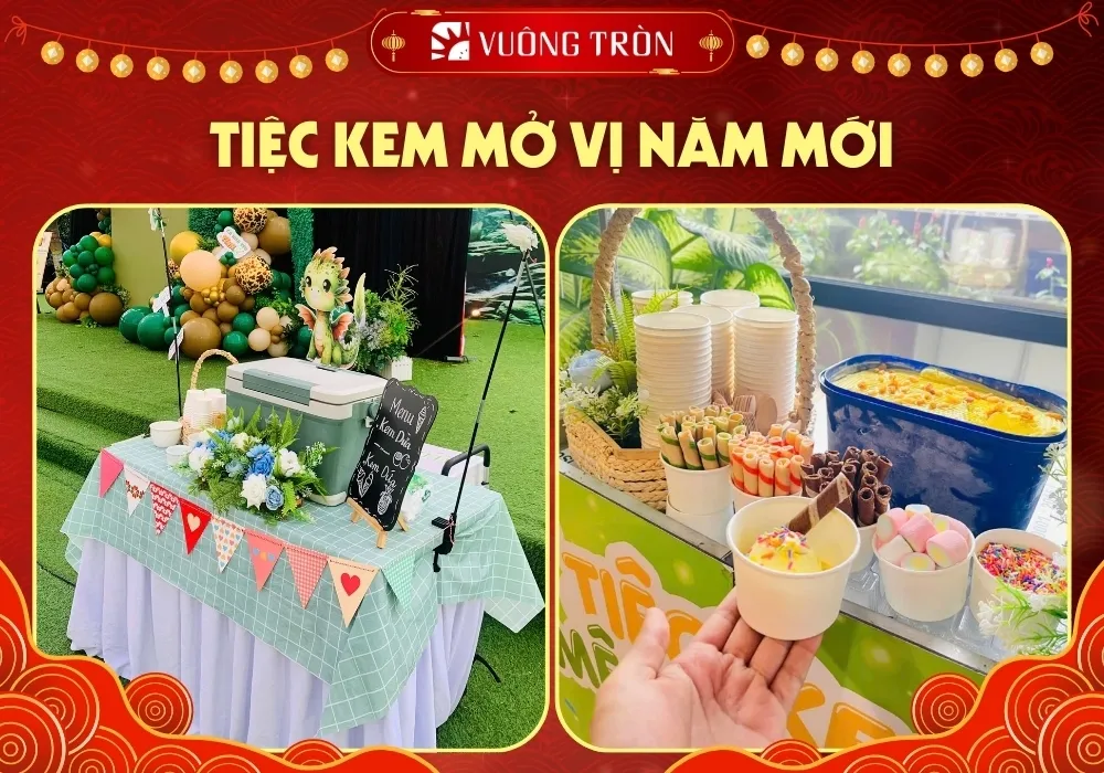 Tiệc kem - mở vị năm mới Kem mang ý nghĩa rất đặc biệt trong bối cảnh sau Tết: mát, nhẹ, dễ ăn và tạo cảm giác đổi vị rõ rệt sau chuỗi ngày ăn nhiều món truyền thống. Một quầy kem nhỏ được đặt ngay sau lễ cúng tân niên thường tạo hiệu ứng khá tích cực: