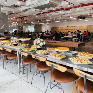 Có hình thức tổ chức giống như tiệc teabreak sinh nhật nhân viên, nhưng menu bên cạnh các món bánh ngọt, mặn) đa dạng, sẽ có thêm một số món mặn để đổi vị và lót dạ cho người dùng như xúc xích xông khói -teriyaki sausage, sour dumpling, bacon sandwich, bò cuộn măng tây,.. tehem trái cây cắt sẵn, rau câu thanh mát và dùng kèm với menu nước đa dạng.