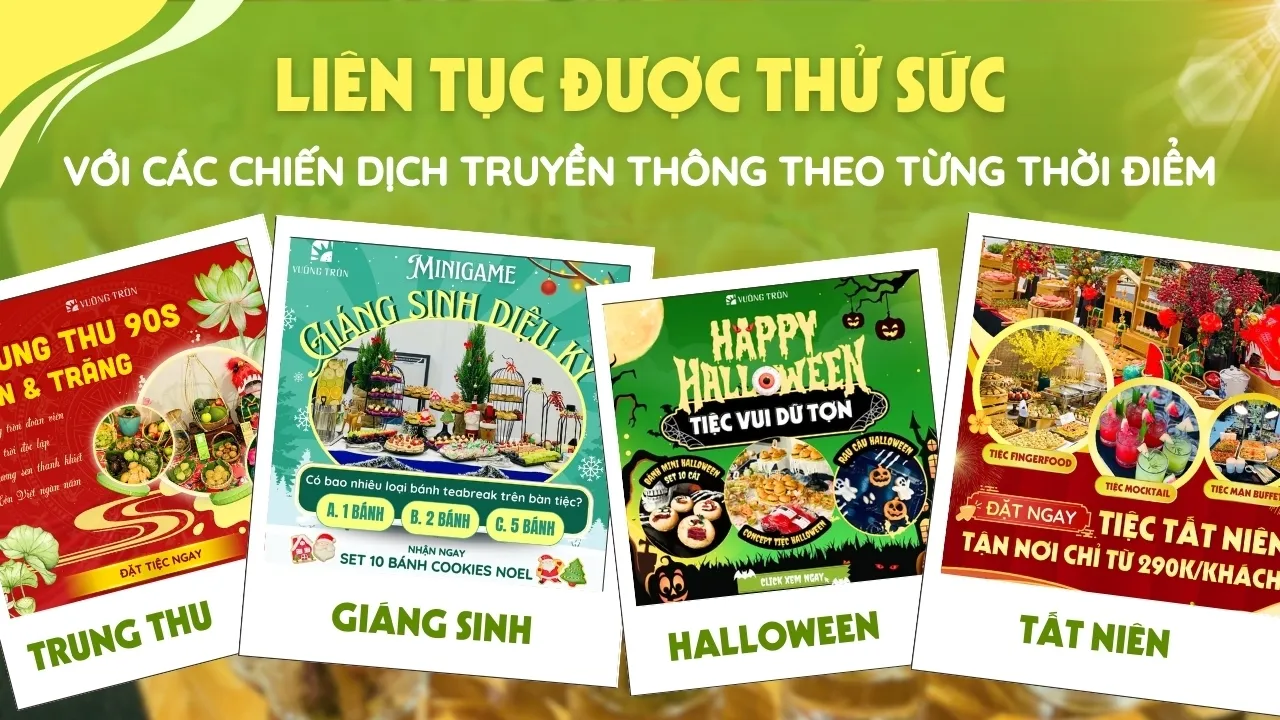 Tại Vuông Tròn, sự đa dạng trong các concept tiệc chủ đề như 8/3, 20/10, Quốc tế Thiếu nhi 1/6, Trung Thu, Giáng Sinh, Tân niên, Tất niên… chính là yếu tố thúc đẩy cảm hứng sáng tạo liên tục cho Content Creator. Mỗi chiến dịch đều mang một màu sắc riêng: concept, chủ đề, thông điệp và hành trình cảm xúc đều thay đổi theo từng mùa lễ.