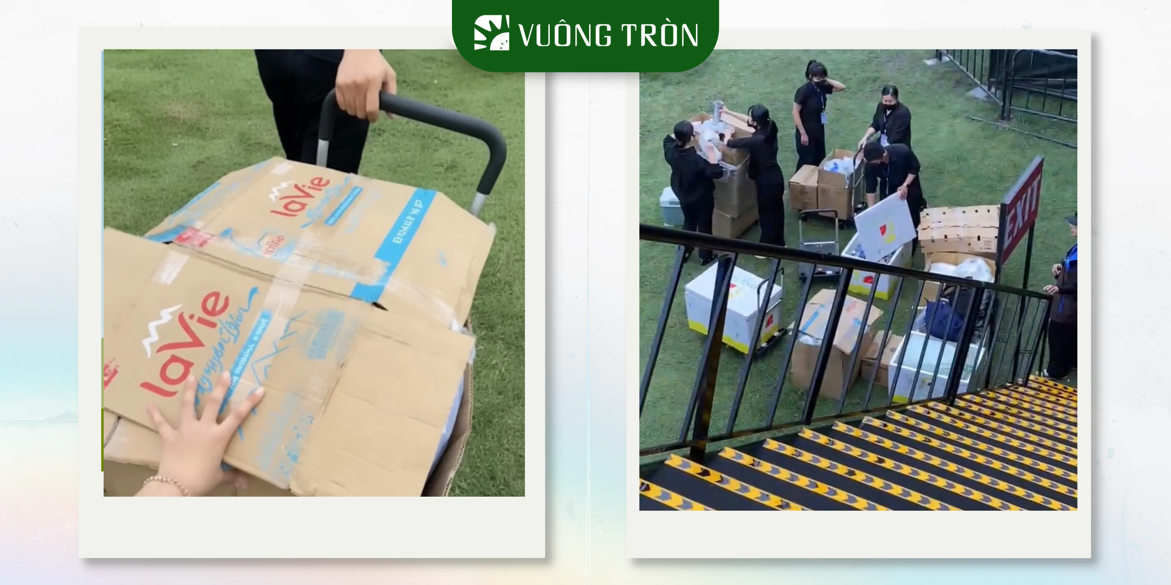 Sau đó là giai đoạn chuẩn bị và vận chuyển. Toàn bộ món ăn, dụng cụ, vật dụng trang trí đều đóng gói theo từng thùng để khi tới địa điểm, đội setup chỉ cần mở ra và bất đầu triển khai. Mỗi người đều có nhiệm vụ rõ ràng: người thì trải khăn, người thì dựng khay, người thì bày món... Mọi thao tác diễn ra trong bối cảnh sân khấu còn đang test âm thanh. Tất cả phải gọn, sạch, đúng concept đã được duyệt trước đó, vì bàn tiệc cũng là "một phần tổng thể của chương trình".