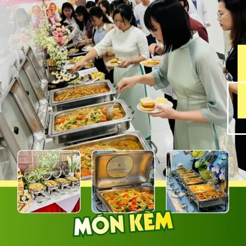Toàn bộ món ăn được bày theo hình thức buffet và hâm nóng liên tục, đảm bảo luôn giữ nhiệt, giúp khách dùng bữa thoải mái, thuận tiện và không lo món ăn bị nguội trong suốt thời gian tiệc. Dịch vụ tiệc buffet tận nơi tại văn phòng, công ty đã bao gồm trọn bộ setup: